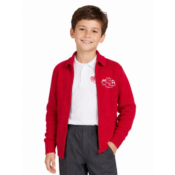 Lleva bolsillos y se abrocha mediante una cremallera. Su color es en rojo, va bordada al igual que el resto de las prendas del uniforme escolar.