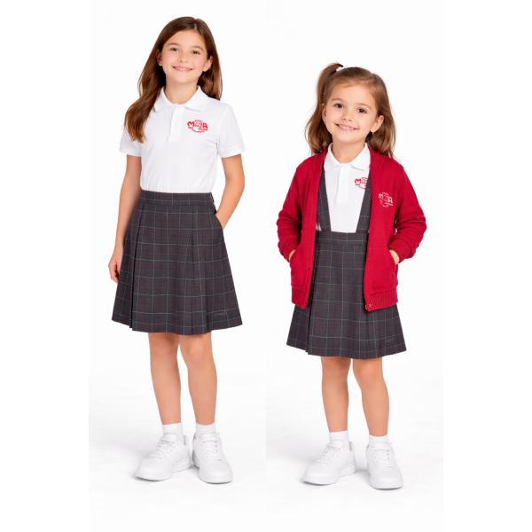 . Falda diseñada para el colegio Manuela Malasaña, junto con el polo blanco y la opción de elegir entre jersey o chaqueta en color rojo.