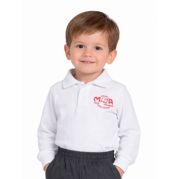 Diseñado igual que el polo de manga corta, en punto de piqué blanco en su totalidad. Los puños son de elástico blanco que se ajusta a la muñeca del niño.